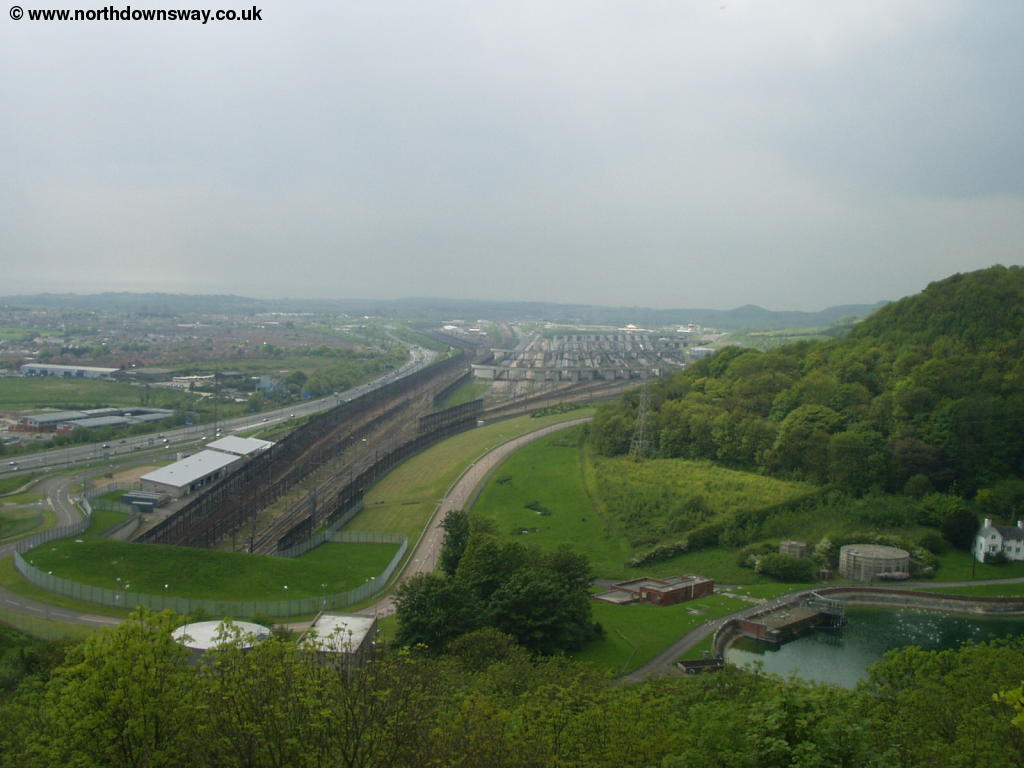 Soon you go round woods round the edge of a reservoir. Here you briefly join the road (Castle Hill) then enter the old works at Caesar's Camp. Below you is a steep value with the round Sugarloaf Hill at the other end. Looking back you can now see the reservoir that was obscured by the trees earlier and the railway lines converging before plunging underground into the Channel Tunnel to France. Ahead, the busy A20 also heads into a tunnel under the cliffs, but this time just to the other side of the downs, rather than to France!